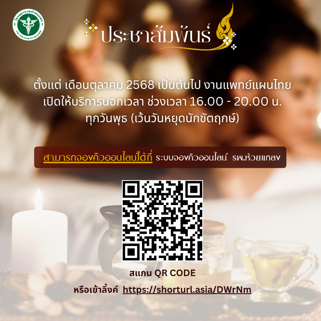 ประชาสัมพันธ์ ตั้งแต่ เดือนตุลาคม 2568 เป็นต้นไป งานแพทย์แผนไทย เปิดให้บริการนอกเวลา ช่วงเวลา 16.00 - 20.00 น. ทุกวันพุธ (เว้นวันหยุดนักขัตฤกษ์) สามารถจองคิวออนไลน์ได้ที่ ระบบจองคิวออนไลน์ รพ.ห้วยแถลง หรือสแกน QR