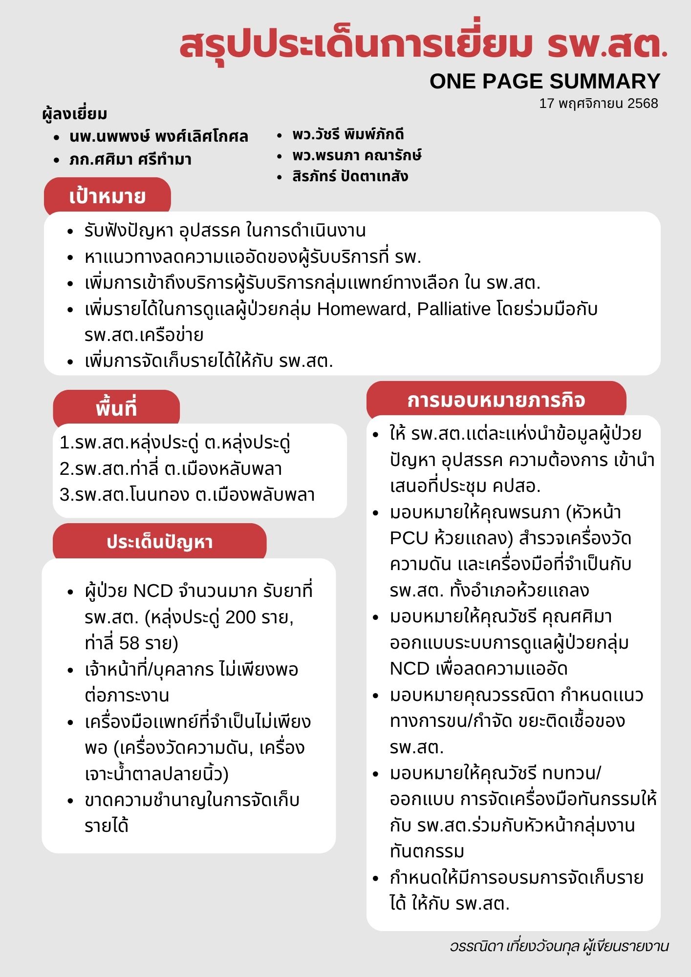 ในวันที่ 17 พฤศจิกายน 2568 โรงพยาบาลห้วยแถลง นำโดยนายแพทย์นพพงษ์ พงศ์เลิศโกศล ผู้อำนวยการโรงพยาบาลห้วยแถลง ลงพื้นที่เยี่ยมและแนะนำตัว ที่ รพ.สต. หลุ่งประดู่ รพ.สต. ท่าลี่ รพ.สต. โนนทอง เพื่อรับฟังปัญหา อุปสรรค แนวทางการดำเนินงานในปีงบประมาณ 2569 และประชุมเตรียมความพร้อมในการต้อนรับรัฐมนตรีช่วยฯ ในวันที่ 28 พฤศจิกายน 2568