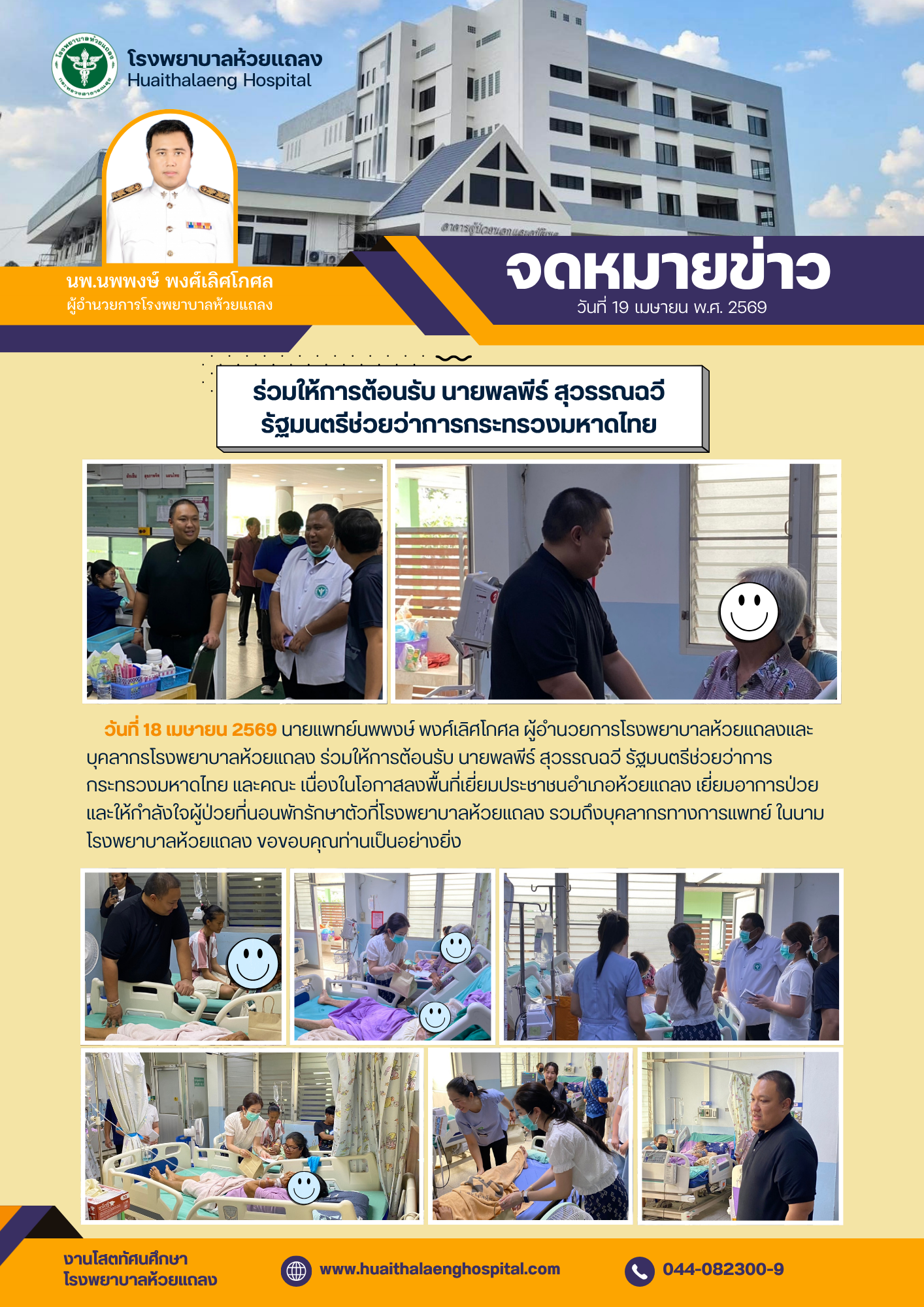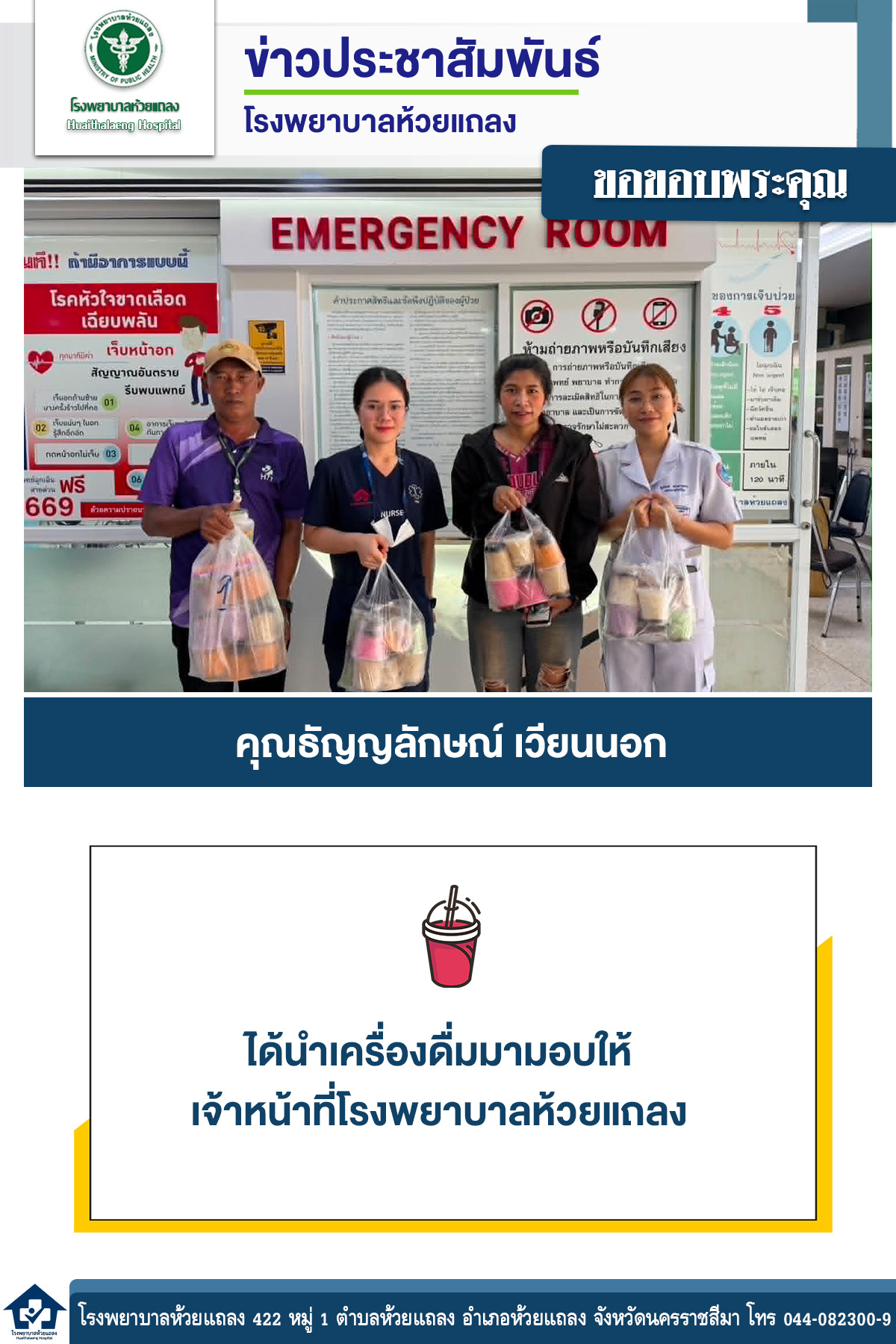 วันที่ 9 เมษายน พ.ศ. 2569 เวลา 10.30 น. นายนพพงษ์ พงศ์เลิศโกศล ผู้อำนวยการโรงพยาบาลห้วยแถลงมอบหมายให้ นายเกีรติศักดิ์ โลไธสง หัวหน้ากลุ่มงานบริหารและนายธีระชัยไตรศักดิ์ ประธานศูนย์บริการอุปกรณ์ทางการแพทย์โดยภาคประชาชน ร่วมรับบริจาคเงินจากคณะคุณครูโรงเรียนเก้งเต็ก จำนวน 10,000 บาท เพื่อซื้อรถเข็นนั่งให้กับ ประชาชนที่มีภาวะพึ่งพิงติดบ้านติดเตียง ในเขต ตำบลห้วยแถลง ขอขอบพระคุณคณะคุณครูโรงเรียนเก้งเต็กเป็นอย่างสูงสำหรับการมีจิตศรัทธาบริจาค และสนับสนุนซื้ออุปกรณ์ ทางการแพทย์ ในครั้งนี้